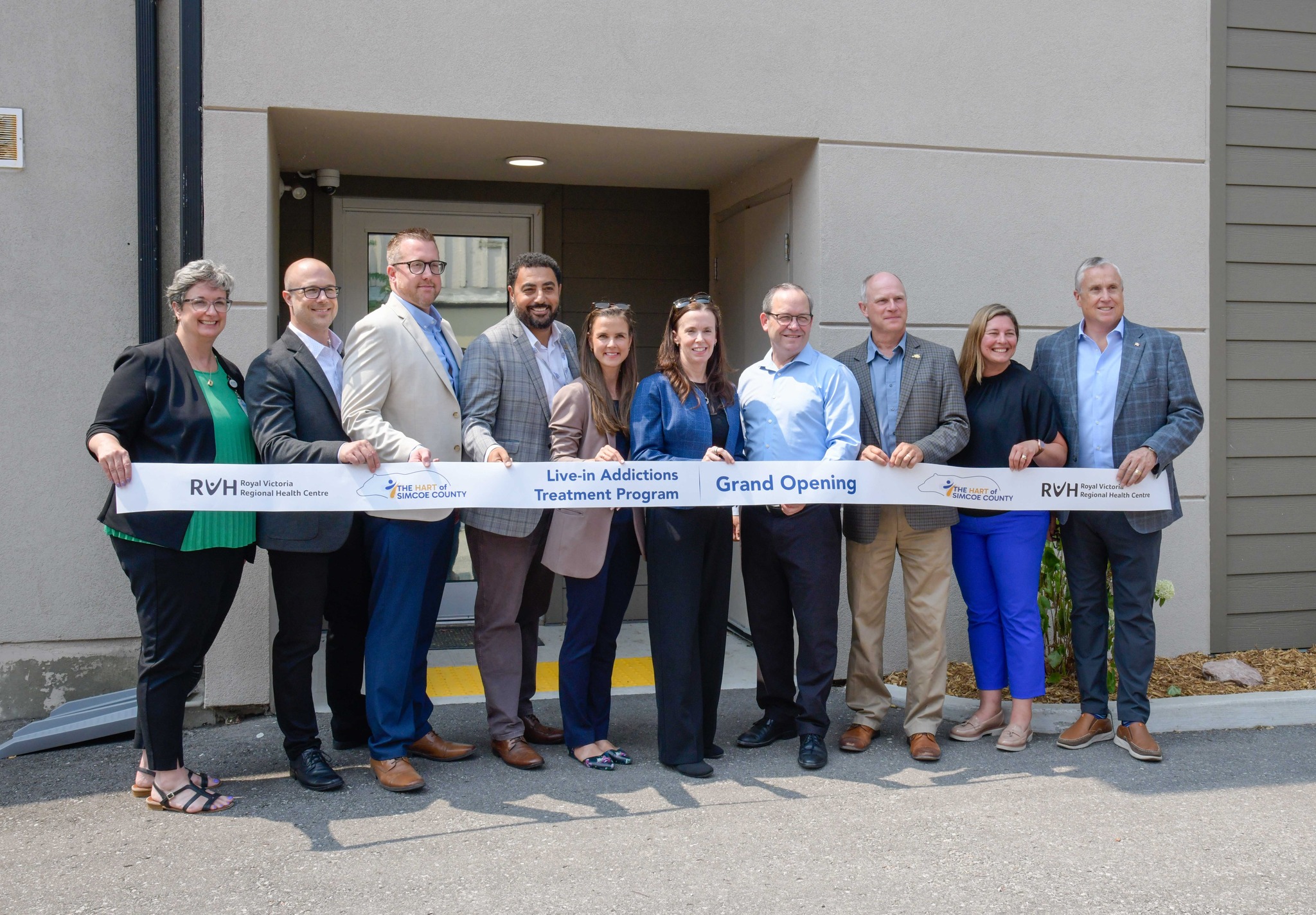 Photo caption: Royal Victoria Regional Health Centre, in partnership with the HART of Simcoe County, welcomed municipal, provincial and federal officials to celebrate the opening of the region’s first publicly funded, co-ed live-in addictions treatment centre. (Left to right) Dana Naylor, Vice President, Clinical, Regional Vice President, Cancer Services, Ontario Health (Cancer Care Ontario); Brian Irving, Manager, Rapid Access Addiction Medicine Clinics and Withdrawal Management Services, RVH; Brandon Lewicki, Operations Director, Mental Health and Addictions Program, RVH; Mina Fayez-Bahgat, General Manager, Social and Community Services, County of Simcoe; Andrea Khanjin, MPP Barrie–Innisfil; Gail Hunt, President and Chief Executive Officer, RVH; Doug Downey, MPP Barrie–Springwater–Oro-Medonte; Basil Clarke, Warden, County of Simcoe; Ann-Marie Kungl Baker, Ward 3 Councillor, City of Barrie; and Doug Shipley, MP for Barrie–Springwater–Oro-Medonte.