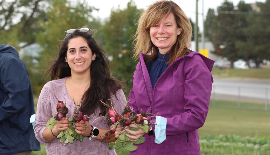 Photo caption: Michelle Stranges, Specialist in Quality, Transformation, and Innovation at St. Joseph’s (left), with Deana D’Ambrosio, Manager of Food and Nutrition Services, in the on-site garden at Parkwood Institute.