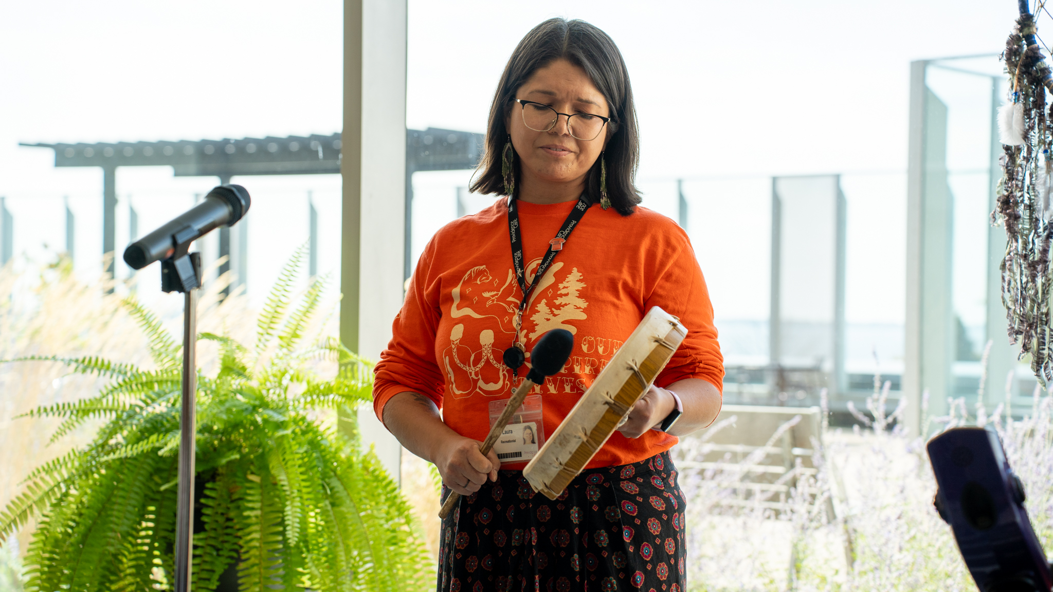 Photo caption: Providence Manor Recreationist Laura Callow Rushworth drums during Providence Care's Truth and Reconciliation gathering.