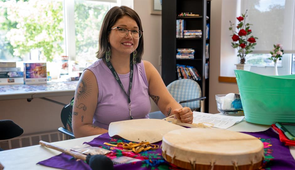 Photo caption: Providence Manor Recreationist Laura Callow Rushworth poses for a photo during an Indigenous drum-making recreation session