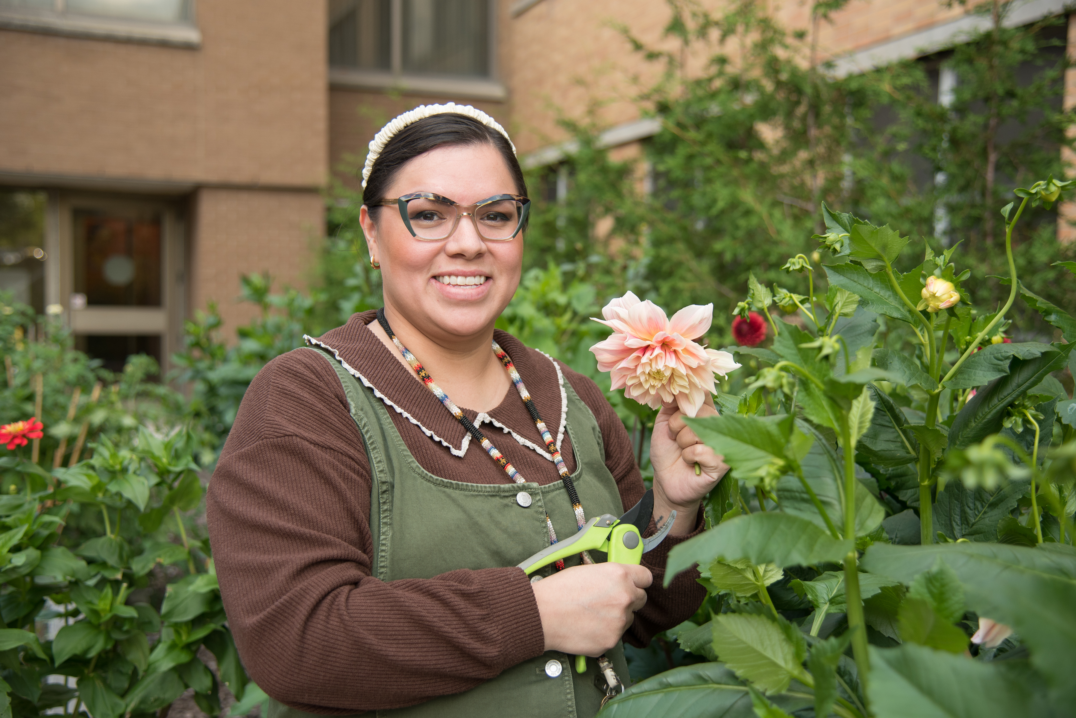Photo caption: Nicole Yawney, Youth Indigenous Wellness Consultant, stands in the Victoria Hospital Indigenous Healing Garden.