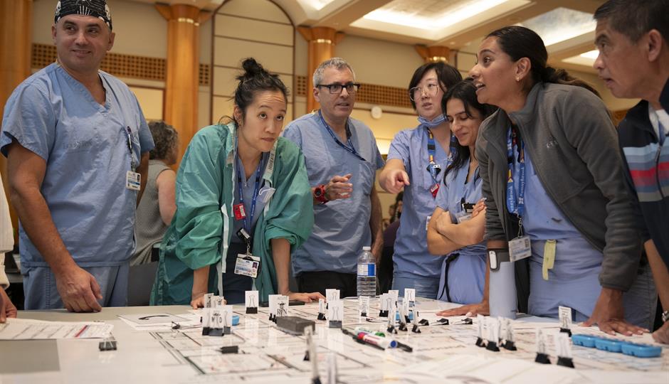 During the mock Code Orange tabletop exercise, Sunnybrook staff used hospital floorplans and movable pieces representing staff, patients and equipment - similar to a board game - to simulate responses to a mass casualty disaster scenario. Their task was to strategize in real-time how units or departments would respond to the real event. Identifying how to best triage patients, where staff are located and how resources are allocated are some of the complex task's teams must work through.