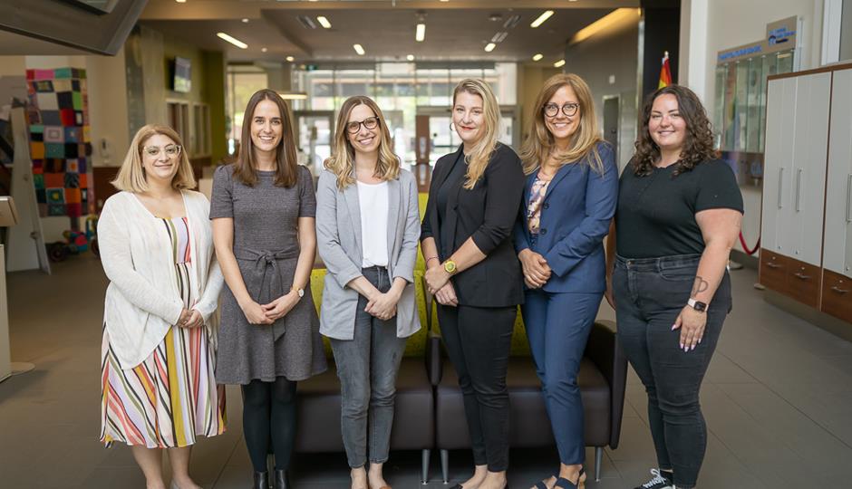 ​In April, Hamilton Health Sciences McMaster Children's Hospital launched the Integrated Pathway for Children and Youth with Extensive Needs pilot program. The team above works collaboratively to support families throughout their complex health-care journeys. From left to right: Dr. Rebecca Shine, Dr. Brittany Jamieson, Erica Siebert, Amanda Hendry, Dr. Irene Drmic, and Katrina Armstrong.​ Group photo by Owen Thomas, Hamilton Health Sciences