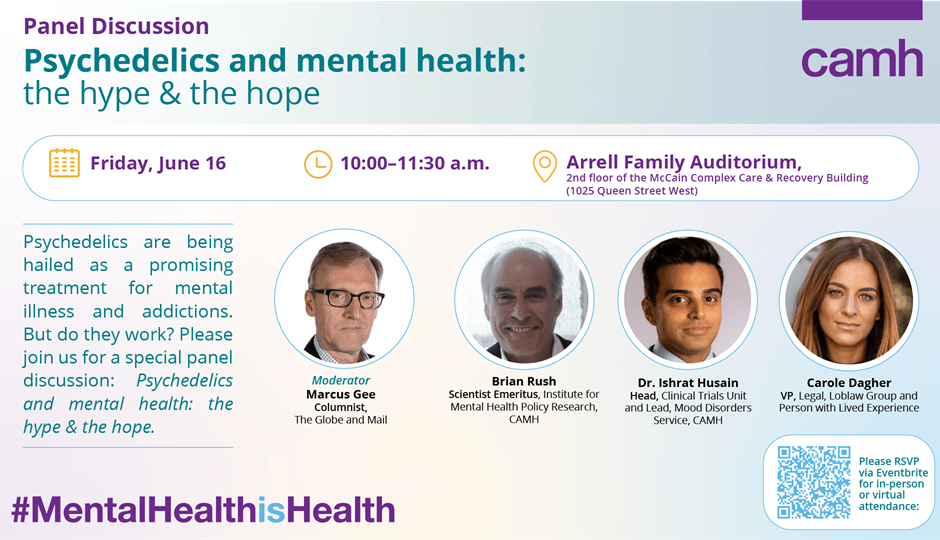 This event is on Friday, June 16 from 10:00 to 11:30 AM at CAMH in the Arrell Family Auditorium on the 2nd floor of the McCain Complex Care & Recovery Building  (1025 Queen Street West). We would love to welcome you in person.