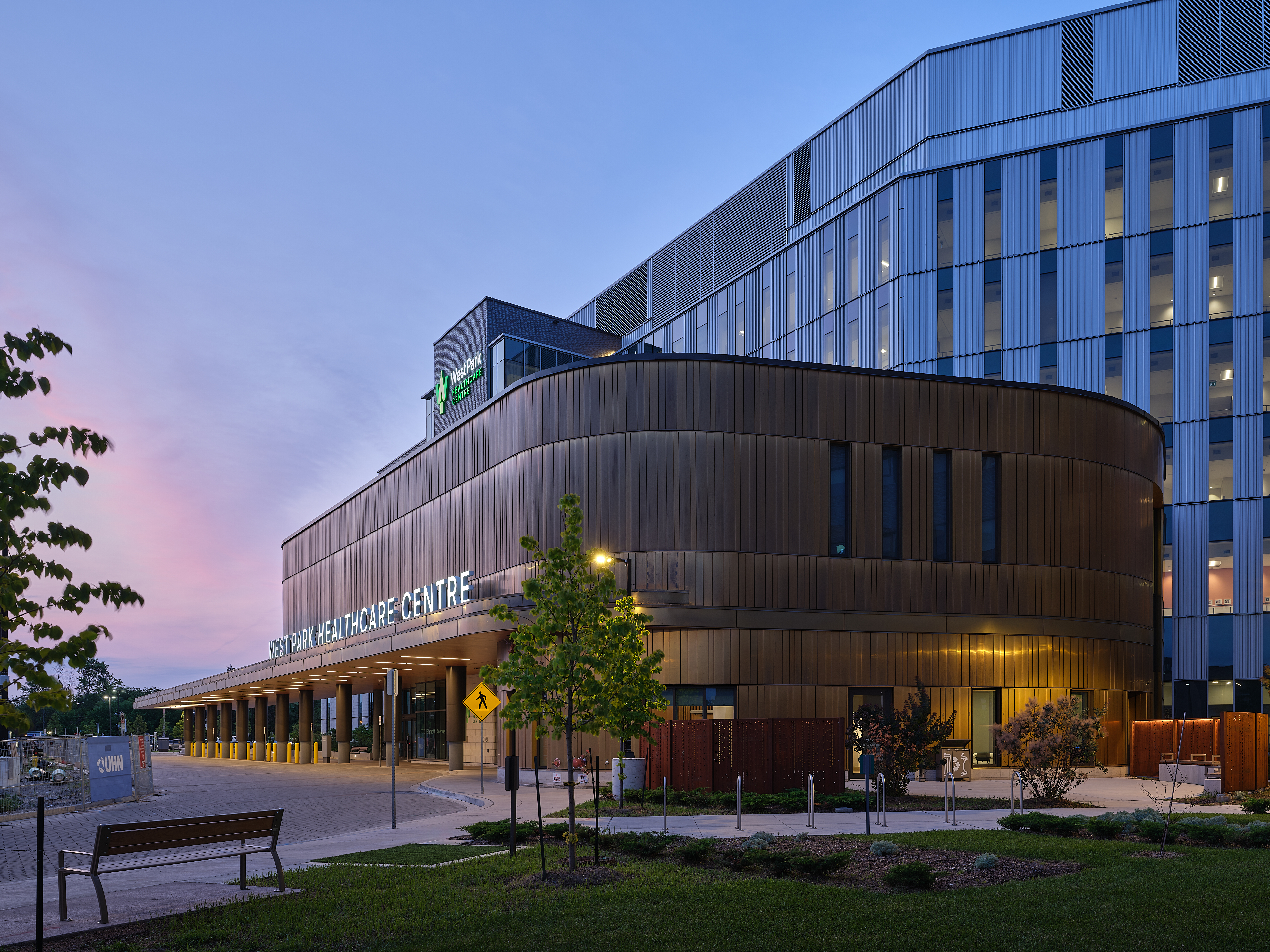 The building's exterior pays homage to West Park's rich natural heritage with the use of wood-like soffits, aluminum, copper-zinc alloy cladding, brick, and stone. These familiar, comforting materials reflect the surrounding environment and create a sense of harmony between the facility and its natural setting. The spiritual garden has fencing that creates vertical lines of circles, each honouring a tree removed for construction and arranged by tree species. Clean air provided by trees has been integral to the hospital's respiratory treatment and general health and well-being since its inception.