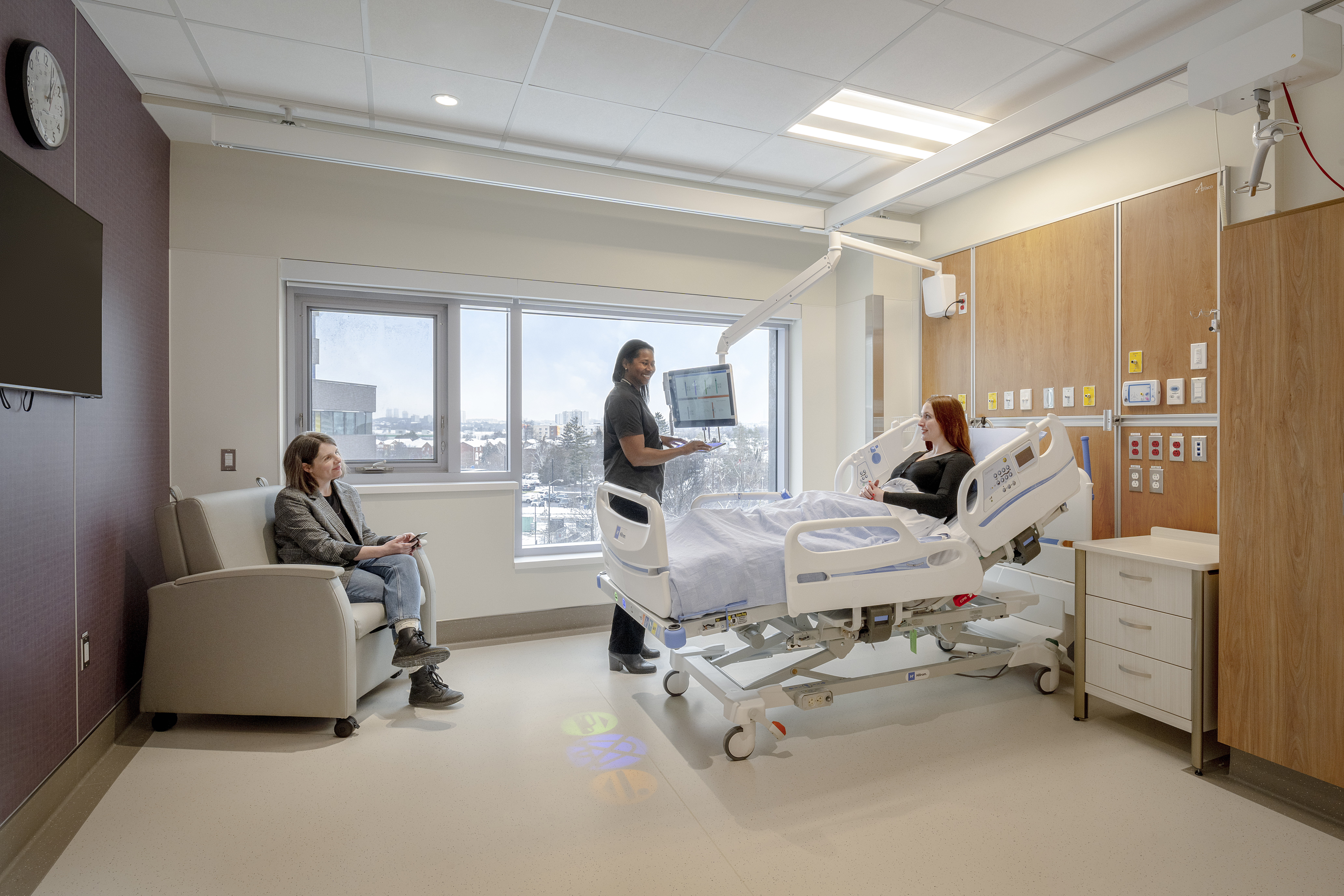 The interior features abundant daylight, expansive views of the outdoors, and natural materials, which create an atmosphere of warmth and comfort. Each patient room is equipped with operable windows and windowsills positioned at a low height, allowing patients to easily look outside and connect with the world while in bed. The building's heating, ventilation, and air conditioning (HVAC) system brings in and filters fresh air, ensuring a continuous supply of clean air throughout the facility.